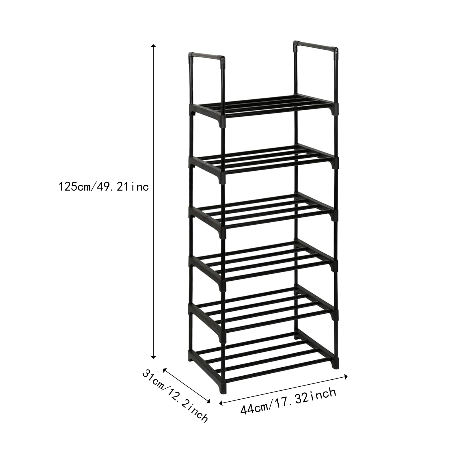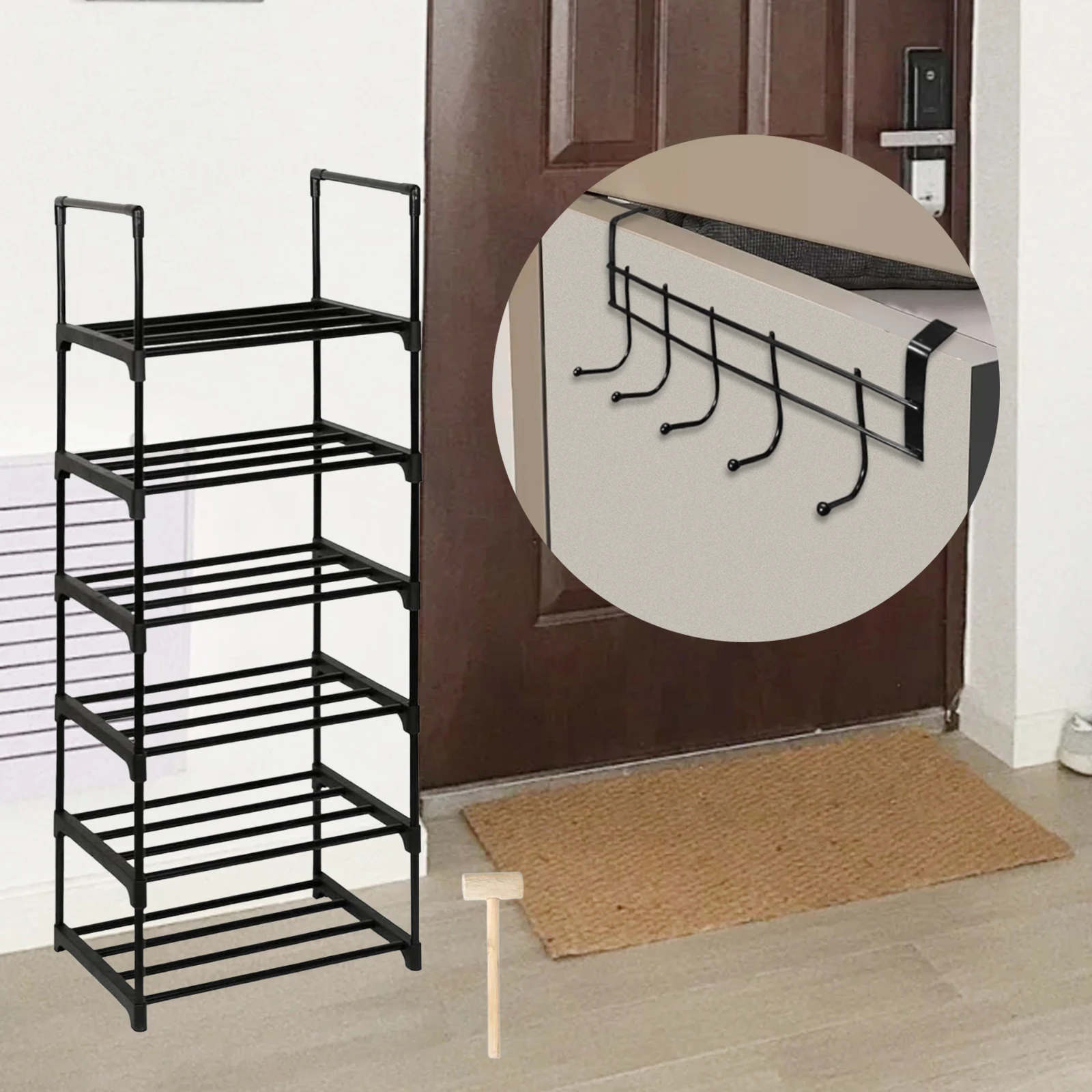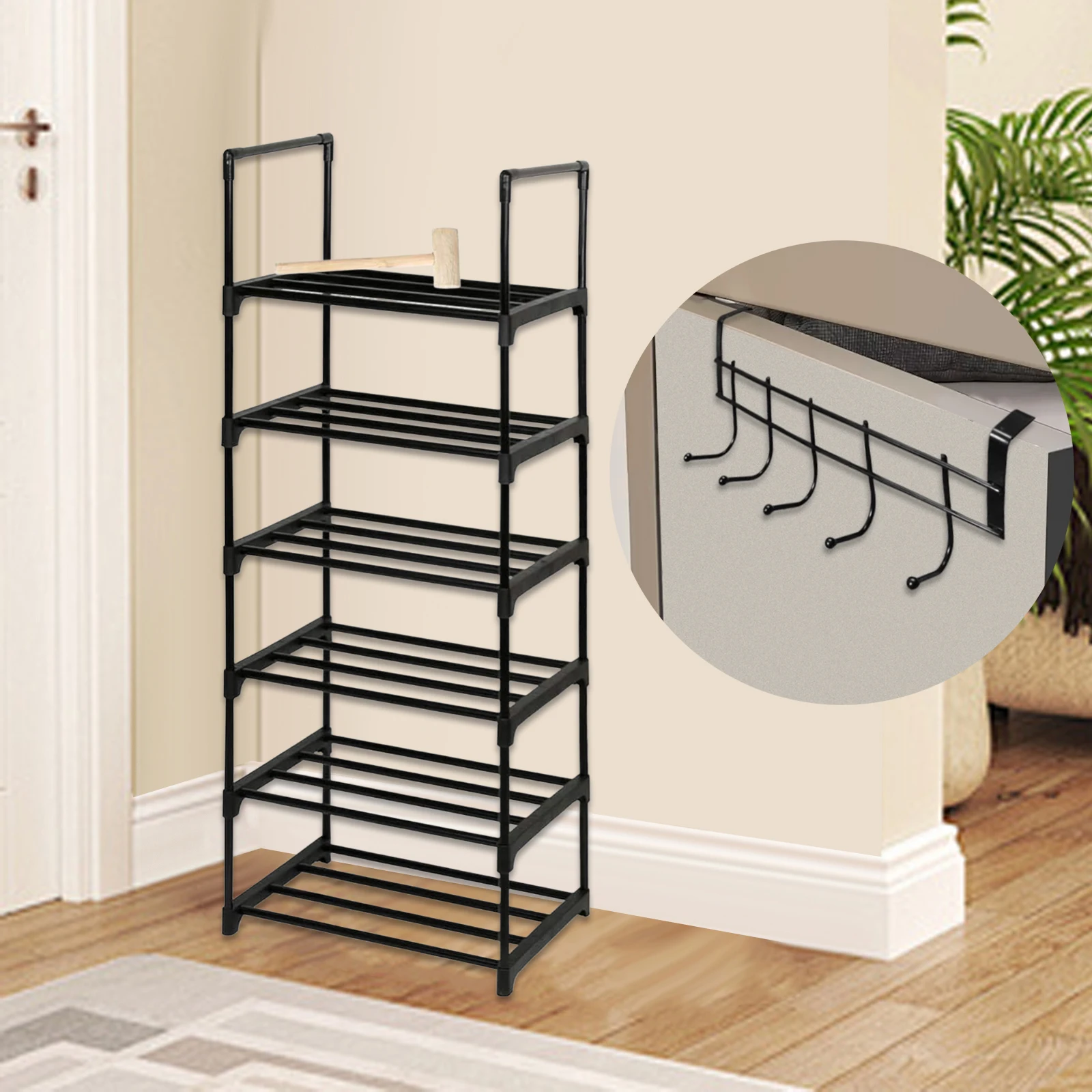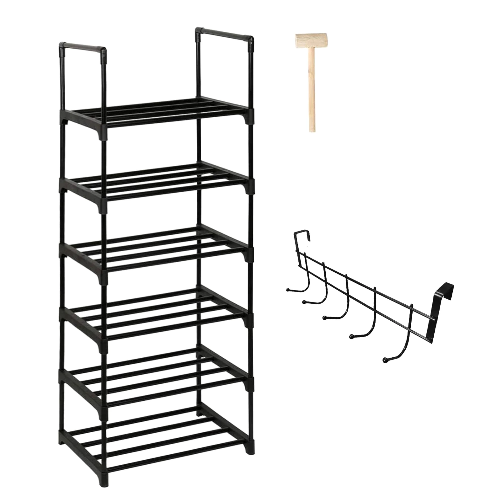 【Product Dimensions & Package Contents】: Once assembled, the shoe rack measures approximately 44*31*125cm. The package includes a shoe rack along with a hammer and a coat hook for easy assembly and installation